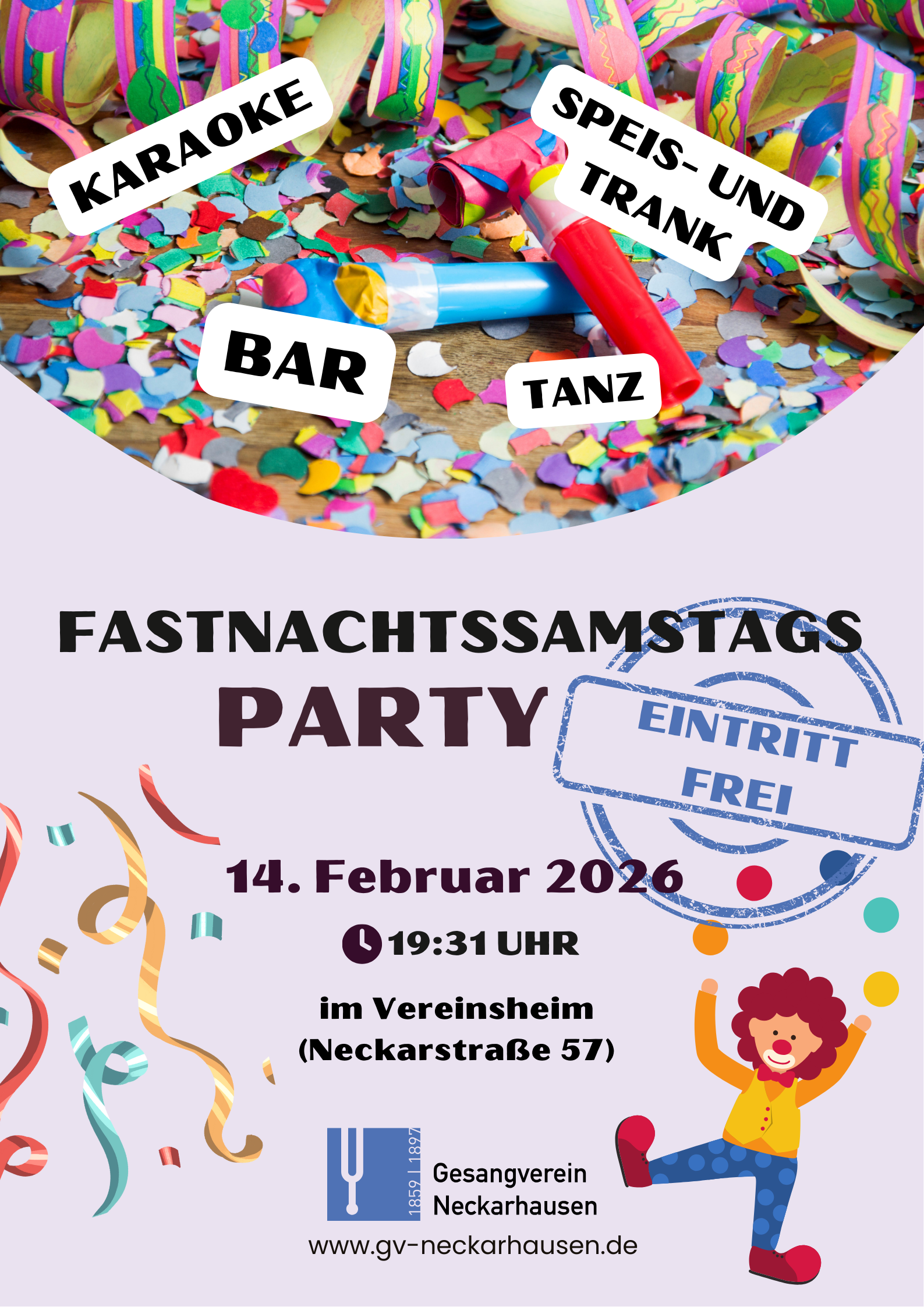 Wir haben Lust Fastnacht zu feiern! Unter diesem Motto laden wir unsere Mitglieder und Freunde zum Fastnachtssamstag beim Gesangverein ein. Der Saal wird zum Tanzraum mit Bar! Und in der Wirtschaft gibt es Sitzmöglichkeiten, sowie Essen und Getränke mit fastnachtlicher Hintergrundmusik - und das Karaoke darf natürlich auch nicht fehlen! Wir freuen uns auf euern zahlreichen Besuch - bei freiem Eintritt!
